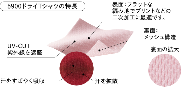 「吸水性」「速乾性」「UV-CUT」を備えスポーツ・アクティブシーンにぴったり。直接肌に触れる面はメッシュ構造になっており、抜群の通気性・吸水速乾性を持ちます。さらに、「4.1オンス」という生地の厚さが快適さに相乗効果を加えます。