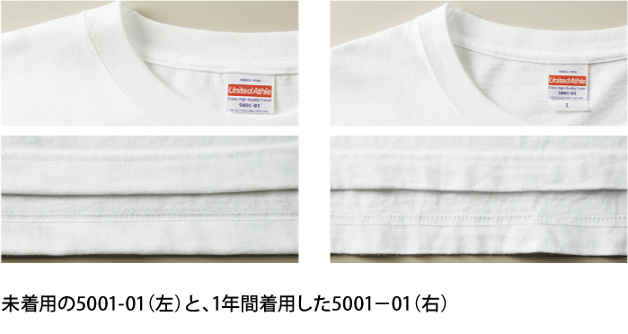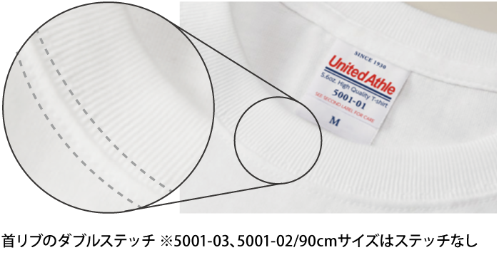 ユナイテッドアスレ5001は首リブに「ダブルステッチ」を採用しているので、着ては洗濯を繰り返しても、首もとがヨレヨレになるなんてことはありません。